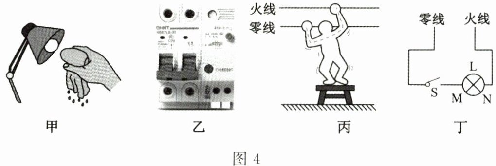 D.图丁中,断开开关后,人站在地上,手接触到灯的左端金属线 M 时不会触电