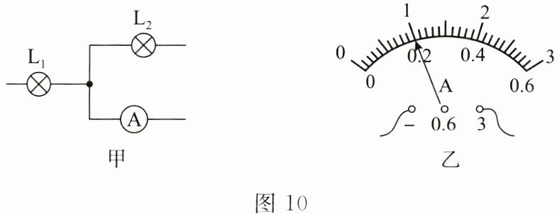 11. 图 10 甲是电路图中的一部分,已知流经灯泡 L₁ 的电流为 0.6 A,流经 L₂ 的电流为 0.4 A,电流表的示数如图 10 乙所示。则下列说法正确的是(