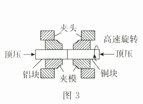 9. 如图3所示,不旋转的铝块在强大压力作用下顶住高速旋转的铜块,使两者接触处温度急剧升高,这样铜块和铝块接触处的分子相互渗透,从而使两者紧密结合在一起,这就是先进的“旋转焊接”技术。下列说法错误的是(