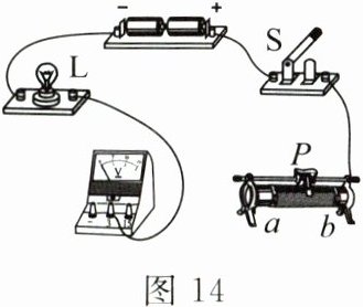 19. 在如图14所示的电路中,有两根导线尚未连接,请用笔画线代替导线将其补上。要求:①闭合开关S后,向左移动滑动变阻器的滑片P,小灯泡变暗;②电压表测量小灯泡两端的电压。