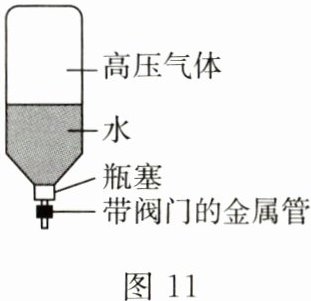 11. 小明用可乐瓶制作水火箭,先在瓶里装适量水,然后将带有阀门的金属管插入瓶塞,旋紧瓶塞后用打气筒往瓶里打足气(如图 11);打开阀门后,水从尾部的金属管向下喷出,水火箭竖直向上飞向空中,下列分析正确的是(