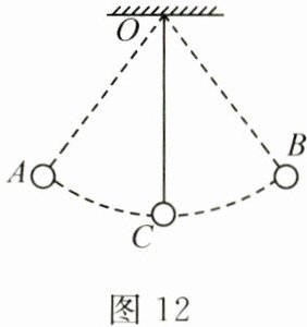 14. 如图 12 所示,在竖直平面内用轻质细线悬挂一个小球,将小球拉至 A 点,使细线处于拉直状态并由静止释放,小球来回摆动时,摆动幅度逐渐减小,这是因为有部分机械能转化为