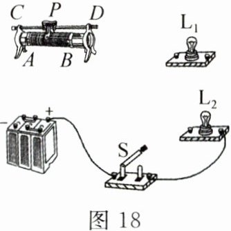 (2)请用笔画线代替导线将图 18 所示的电路连接完整。要求:灯泡 L₁、L₂并联,开关同时控制两个灯泡,滑动变阻器只控制灯泡 L₁的亮度,且滑片向左移动时,灯泡 L₁变亮。
