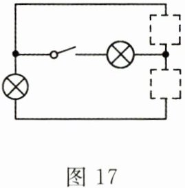 19. (1)图 17 所示,在图中两个虚线框内接入电源或开关,画出“电源”和“开关”的符号,使开关都闭合时两个灯泡组成并联电路。