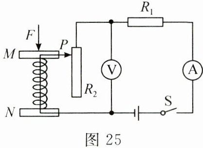 25. (10 分)压力传感器的原理图如图 25 所示,其中 M、N 均为绝缘材料,MN 间有可收缩的导线,弹簧上端和滑动变阻器 R₂的滑片 P 固定在一起,电源电压为 10 V,R₁ = 8 Ω,R₂的阻值变化范围为 0~10 Ω。闭合开关 S,压力 F 与 R₂的变化量成正比;当 F = 1 N 时,R₂为 2 Ω。