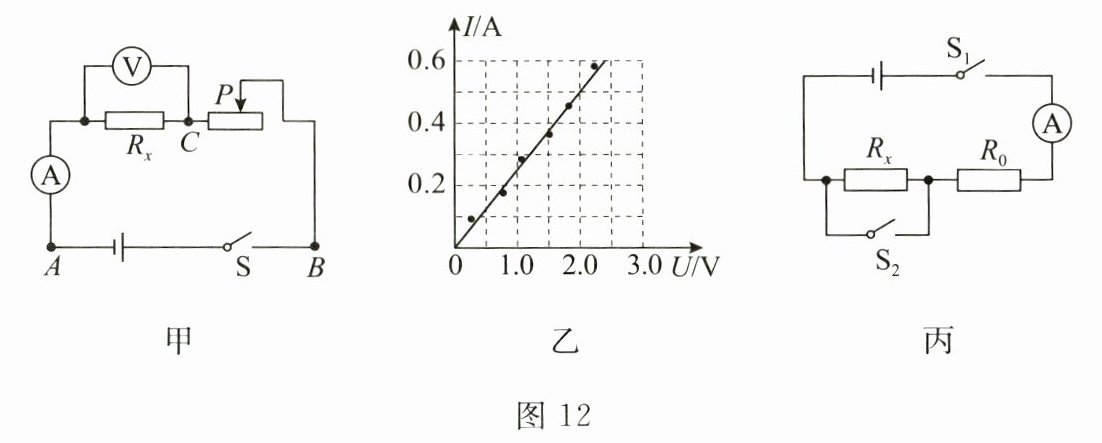 $ \Omega $。(3)小芳又设计了一种方案,也测出了 $ R_x $ 的阻值。电路如图 12 丙所示,$ R_0 $ 为阻值已知的定值电阻,电源电压未知且恒定不变。测量步骤如下: