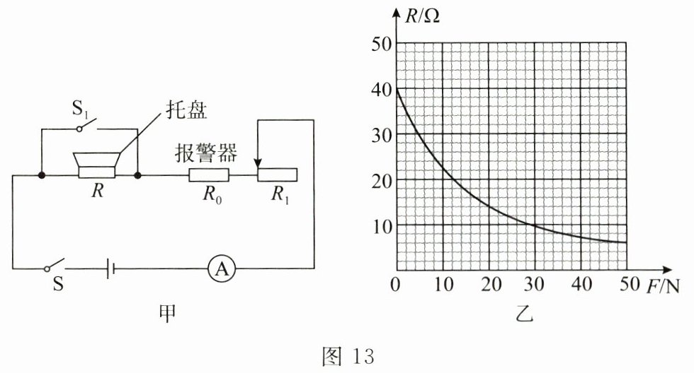 18. 电梯超载时,报警器会发出警报声以提醒后面进入的乘客退出电梯。某实验小组的同学用电源、开关、导线、压敏电阻、报警器、滑动变阻器($ 2 \, A $ $ 50 \, \Omega $)等模拟电梯的报警电路,如图 13 甲所示。闭合开关 $ S $ 和 $ S_1 $,滑动变阻器的滑片位于最左端,电流表示数为 $ I = 0.5 \, A $。已知电源电压 $ U $ 保持不变,压敏电阻 $ R $ 的阻值随压力 $ F $ 变化的规律如图 13 乙所示。报警器相当于一个定值电阻,阻值 $ R_0 = 30 \, \Omega $,当电流表的示数为 $ 300 \, mA $ 时报警器刚好报警。电流表“$ 0 \sim 0.6 \, A $”的量程连入电路,通过向托盘里加减物品改变压敏电阻受到的压力大小,托盘下表面是绝缘材质,不考虑电流表对电路的影响。