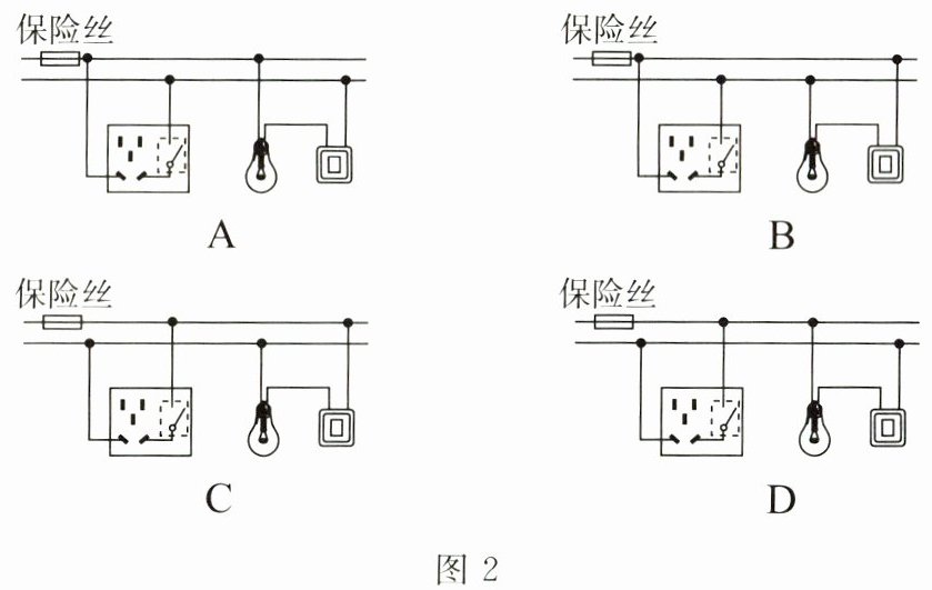 9. 将带有开关的五孔插座和灯泡接入家庭电路中,图2所示电路中接法符合安全用电原则的是(