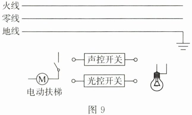19. 某商场的地下一层有一部电动扶梯和一盏大功率的电灯,电灯只在晚上且有声音时工作,照亮电动扶梯,帮助行人安全通行。电动扶梯由开关控制。请你根据要求在图9中完成电路连接。