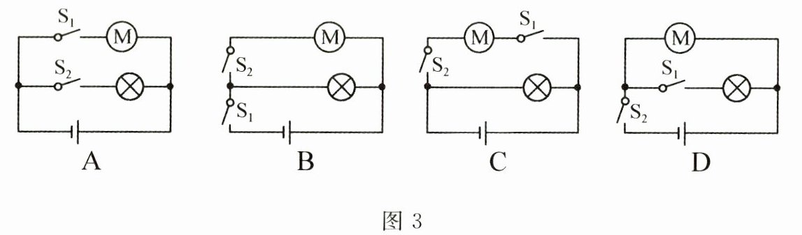 10. 破壁机可以打碎食物,在破壁机上设置了安全开关S₁和工作开关S₂,将装有食物的破壁机的容器放在主机上时,安全开关S₁自动闭合,安全指示灯亮起;再闭合工作开关S₂,电动机启动;安全开关S₁断开时,安全指示灯与电动机均不工作。图3所示的电路符合上述要求的是(