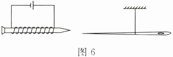 10. 小明在户外实践中,利用随身所带物品制作了简易指南针。他首先利用电池、带绝缘皮的导线、铁钉制成电磁铁,然后将缝衣针磁化并用细线水平悬挂,最后将两者靠近,静止时位置关系如图 6 所示。下列说法正确的是(