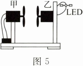 9. 图 5 是小明自制的能量转化装置。接通电路后甲风扇转动,其产生的风带动乙风扇转动,与乙风扇连接的 LED 灯发光。下列说法正确的是(