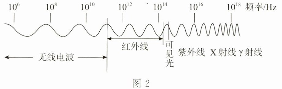 7. 某智能手机的“近场通讯”“蓝牙”功能分别使用 $1.56×10^{7}$ Hz、$2.4×10^{9}$ Hz 这两种频率的电磁波进行通信。图 2 是电磁波分类简图,关于以上两种电磁波的说法错误的是(