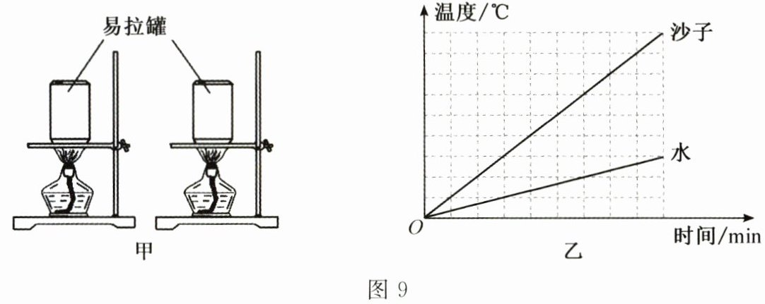 相同就可以确定水、沙子吸收了相同的热量;图 9 乙为小强通过实验数据作出的温度—时间图像,由此可知沙子的比热容小于