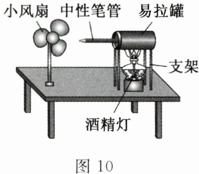 实验时向易拉罐内部注入大约半罐水,将去掉笔芯和尾塞的中性笔的尾端插入易拉罐内,用胶将罐的开口处密封。将易拉罐放置在支架上,笔的尖端对准小风扇的扇叶。点燃易拉罐下面的酒精灯,当有蒸汽喷出时,扇叶就转动起来。