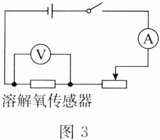 10. 水中溶氧量是水产养殖的一项关键指标。小红利用溶解氧传感器设计了自动充氧装置,其中监测电路如图3所示,电源电压保持不变。溶解氧传感器的阻值随水中溶氧量的降低而减小。闭合开关,当溶氧量降低时(