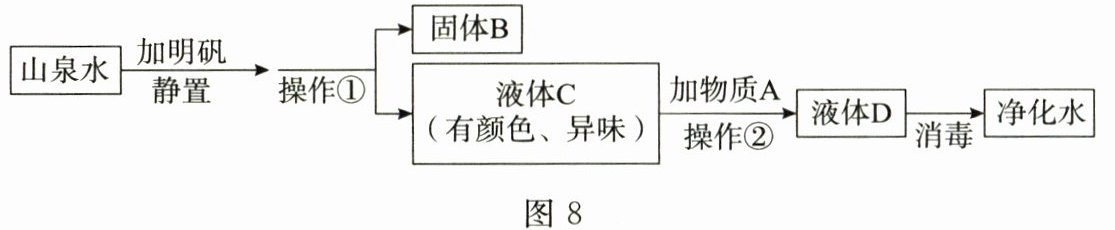 18. 某兴趣小组的同学在野外收集了一瓶浑浊的山泉水,他们在化学实验室模拟自来水厂的净化流程(见图 8)对其进行净化处理。