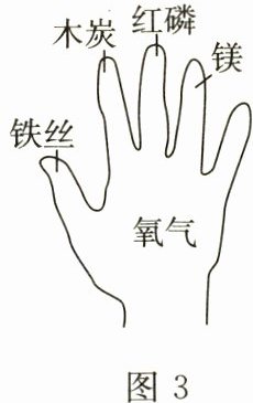22. 构建知识网络是化学学习的常用方法。如图 3 所示,小松用手掌总结氧气的化学性质,手指上代表的物质均能与手心代表的氧气反应。