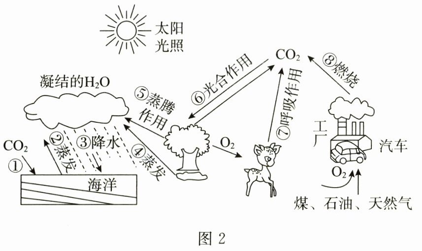 14. 图2表示自然界中存在的三大循环(水循环、氧循环、碳循环)。根据图示判断,下列说法错误的是(