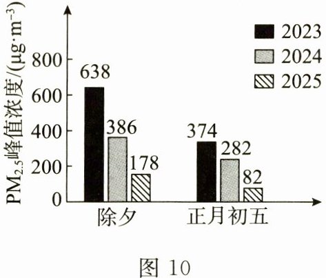(4)图10是某市近三年除夕和正月初五的PM₂.5峰值浓度。由图可知,2023年到2025年春节期间,该市的空气质量的变化趋势是