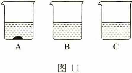 (3)在学习“物质在水中的溶解”时,小科进行了如下实验:向A、B、C三个烧杯中分别装入等质量的水,相同温度下,向三个烧杯中分别加入50g、25g、5g同种固体物质,充分溶解后静置,现象如图11所示。