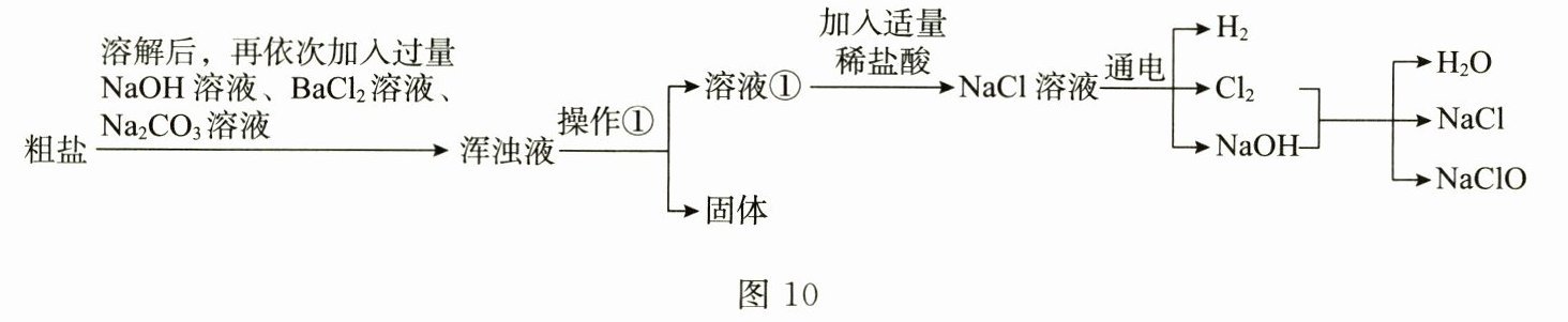 26. 84 消毒液(有效成分是 NaClO)是一种常用的环境消毒剂,某同学用粗盐(含 CaCl₂、MgCl₂、Na₂SO₄、泥沙等杂质)制取 84 消毒液的流程如图 10 所示。