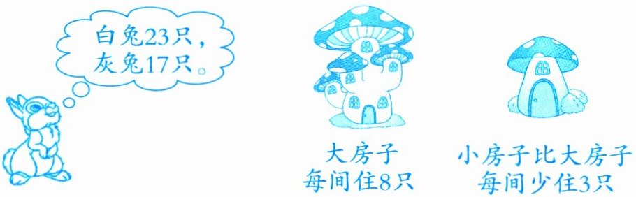 (1) 已知白兔$23$只,灰兔$17$只;大房子每间住$8$只,小房子比大房子每间少住$3$只。