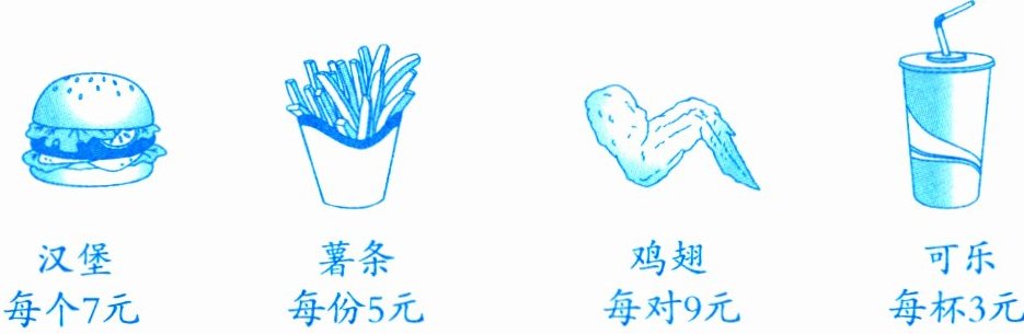 1.20−2=18(元) 汉堡:18÷7=2(个)⋯⋯4(元) 薯条:18÷5=3(份)⋯⋯3(元) 鸡翅:18÷9=2(对) 可乐:18÷3=6(杯) 买的可能是2对鸡翅或者6杯可乐