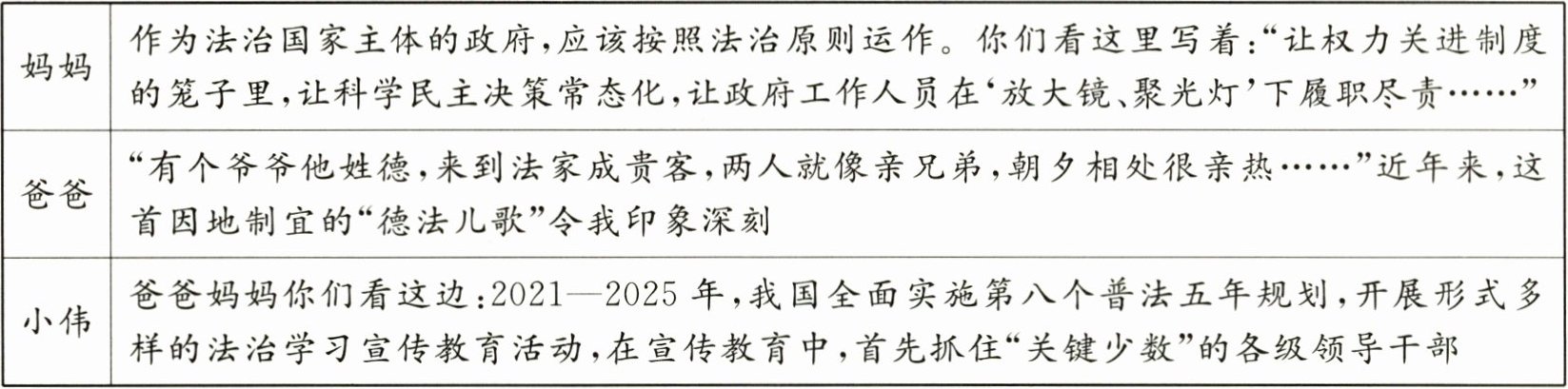 (1)妈妈的话会给法治政府建设带来哪些思考?(4 分)