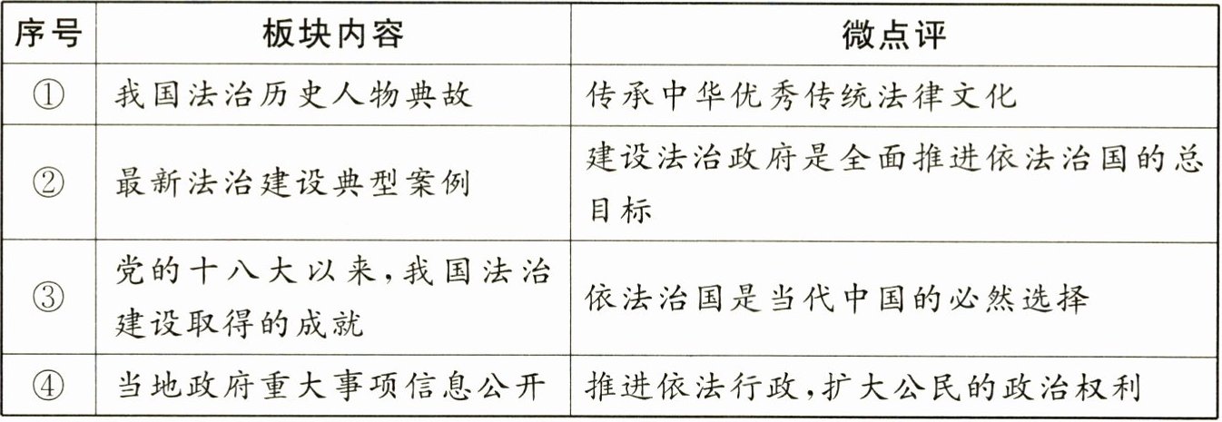 17. 某市法治文化主题公园由四个板块组成。下列对板块内容的微点评,正确的是( )