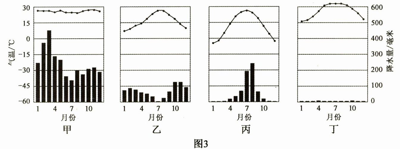 读甲、乙、丙、丁四地的气候资料图(图3),完成5—6题。