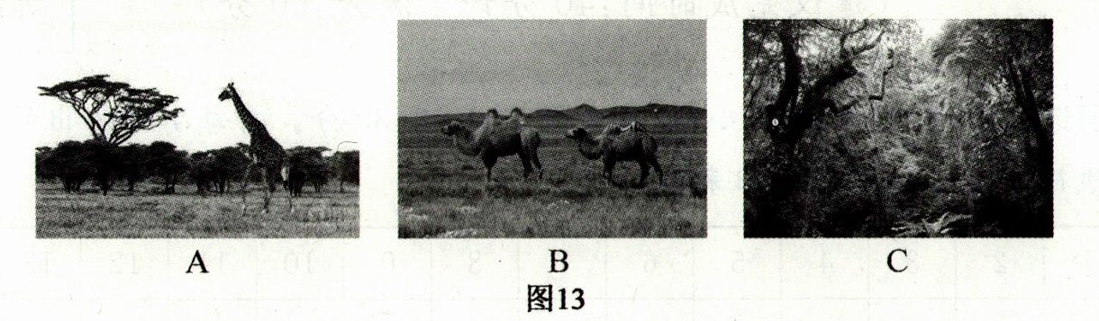 。(2分)(3)柯本在划分气候类型的过程中,也会参照当地的自然景观。图13所示景观图中,能够反映甲气候特征的字母代号是