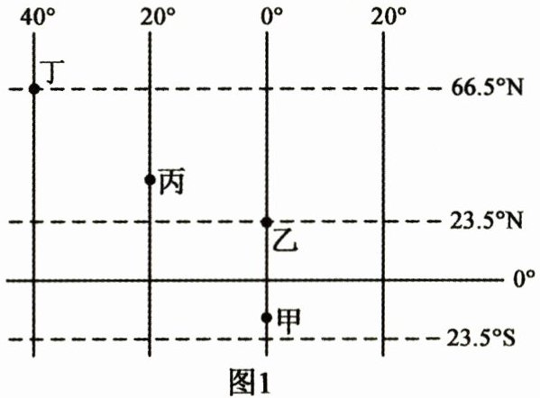 C. 丁地位于北极圈上,它的前后左右都是南方