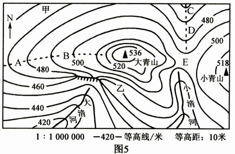 11.C(提示:读图可知,大青山山顶的海拔为536米,小青山山顶的海拔为518米,故大青山山顶的海拔比小青山山顶的海拔高18米;大清河流经地区的等高线比小清河流经地区的等高线密集,故大清河的水流更湍急;A—B处等高线的弯曲部分向低处凸出,为山脊部位,C—D处等高线的弯曲部分向高处凸出,为山谷部位;E处为鞍部,地势东西两侧高,中间低) 12.B
