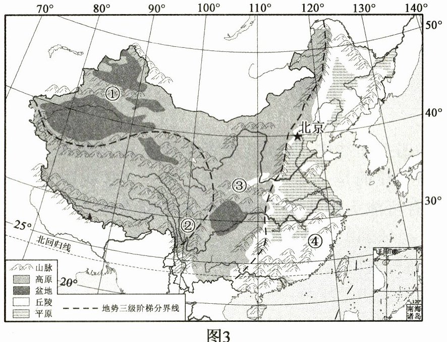 读我国地势三级阶梯示意图(图 3),完成 7—9 题。