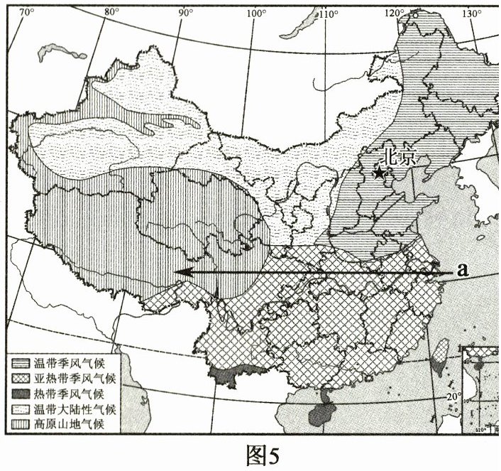 气候的分布受纬度位置、海陆位置、地形等多种因素的影响。读我国气候类型分布图(图 5),完成 12—13 题。