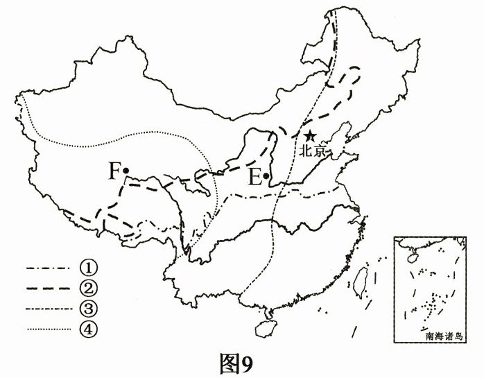 (1)图 9 的①②③④四条曲线中,与 400 毫米年降水量线基本一致的是