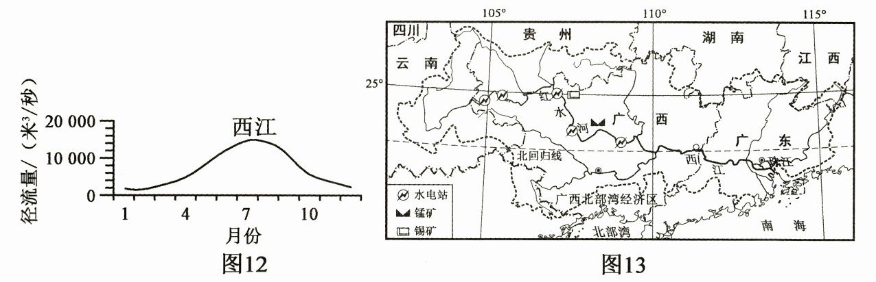 20. 西江是珠江水系的最大干流。读西江径流量年变化曲线图(图 12)和珠江水系示意图(图 13),完成下列各题。(6 分)