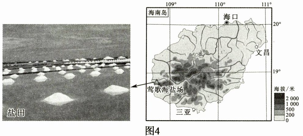 读海南岛地形及莺歌海盐场景观图(图4),完成11—12题。