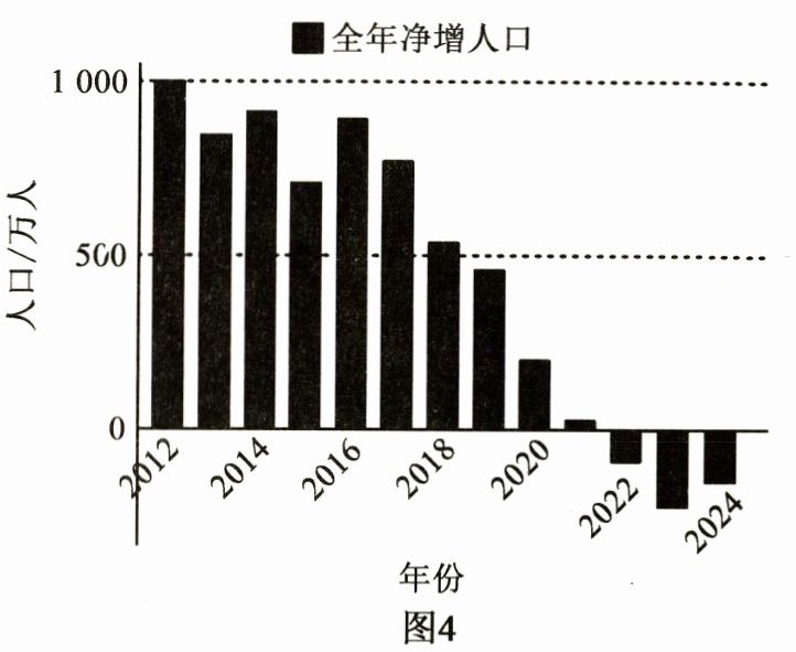 国家统计局发布的人口数据显示:截至 2024 年年末,全国人口数量约为 14.08 亿人(该数据不包含香港、澳门特别行政区和台湾省人口数),比上年末减少 139 万人。读图 4,完成 10—12 题。