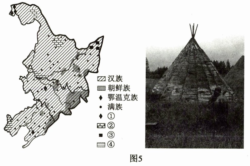 “鄂伦春”一词有两种含义,即“使用驯鹿的人”和“山岭上的人”。鄂伦春族的传统民居是便于搭盖的“斜仁柱”。“斜仁柱”利用天然树枝搭建主体,民居外部夏季用桦树皮和树叶覆盖,冬季用兽皮覆盖。图 5 为东北地区部分少数民族分布及“斜仁柱”景观图。据此,完成 13—15 题。