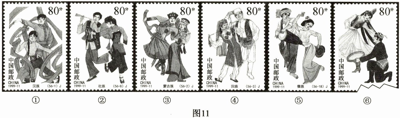 20. 读我国某年国家邮政局发行的部分民族大团结纪念邮票图片(图 11),完成下列各题。(6 分)