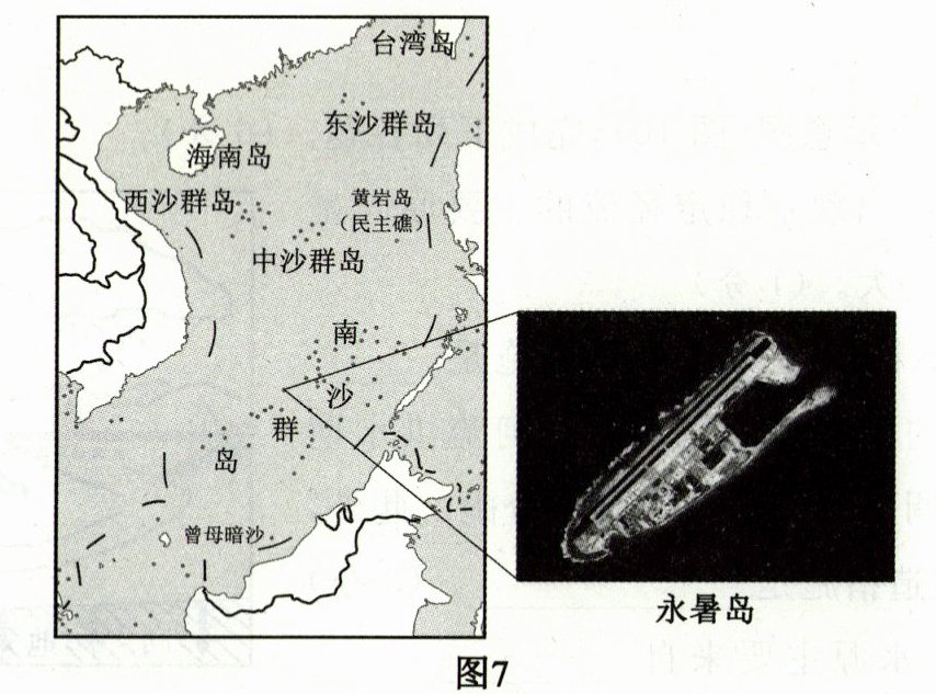 永暑岛隶属于海南省三沙市,是我国经吹沙填海建造的人工岛,岛上建有机场、港口等设施。读我国永暑岛所在海域示意图(图 7),完成 14—15 题。
