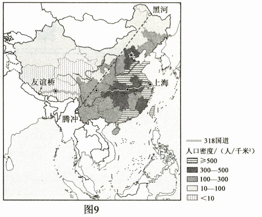 19. 小凯一家计划假期自驾车沿 318 国道游览,出发前他们查阅了一些资料。根据图 9(见下页)及所学知识,完成下列各题。(6 分)