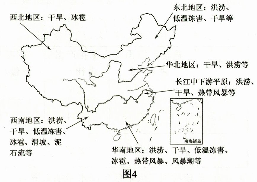 读我国主要自然灾害空间分布示意图(图4),完成12—13题。