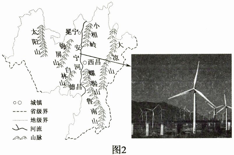 安宁河流经四川省凉山彝族自治州,其自冕宁县泸沽镇至德昌县城的河段河面宽阔,多大风天气,春、秋季风力最为强盛,因此这里成为我国重要的风力发电场。图 2 为凉山彝族自治州部分山河示意和安宁河谷风力发电设施景观图。据此,完成 3—4 题。