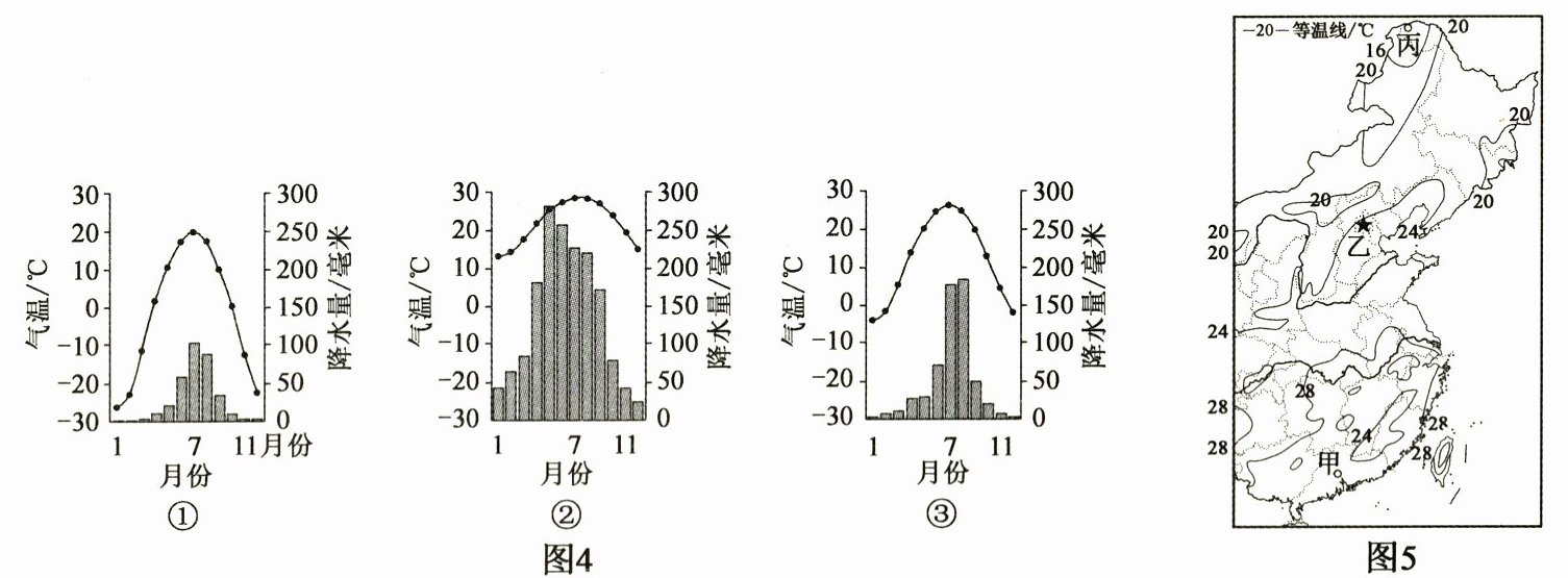 9. 若图 4 中①②③三个城市的位置与图 5 中甲、乙、丙三地对应,则下列配对正确的是(