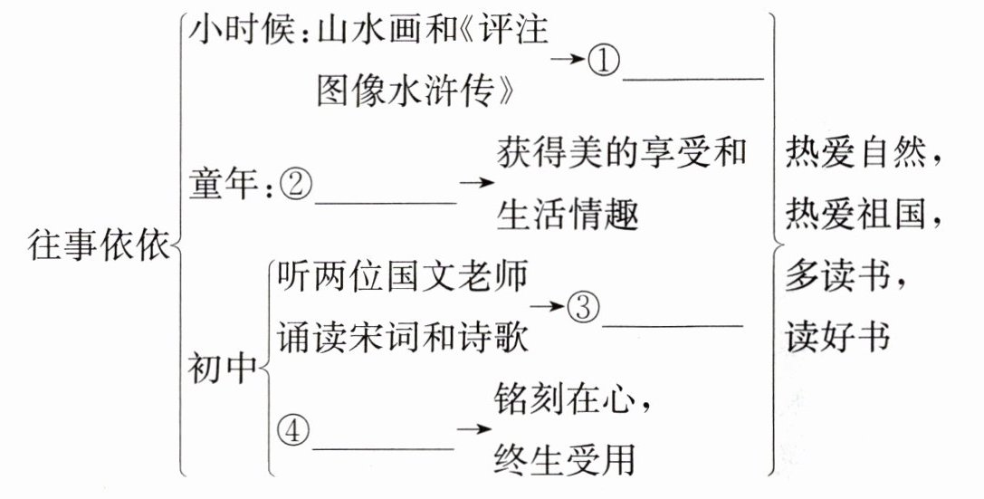 $\begin{cases}小时候:山水画和《评注图像水浒传》 \to ① $_________$ \\童年:② $_________$ \to 获得美的享受和生活情趣 \\初中\begin{cases}听两位国文老师诵读宋词和诗歌 \to ③ $_________$ \\④ $_________$ \to 铭刻在心,终生受用\end{cases}\end{cases}$