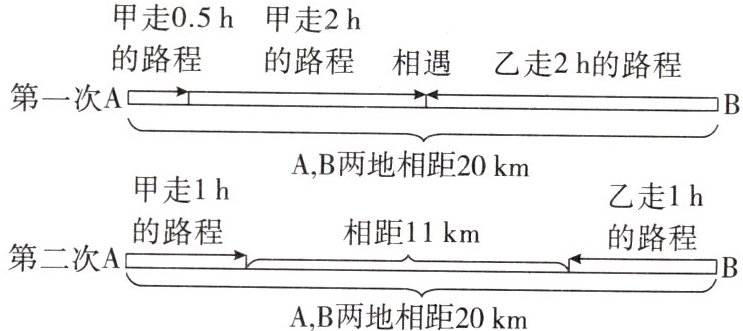 3. 甲、乙两人分别从相距20km的A,B两地出发,相向而行.如图所示的是小华绘制的甲、乙两人运动两次的情形.设甲的速度是x km/h,乙的速度是y km/h.根据题意,可列出的方程组是