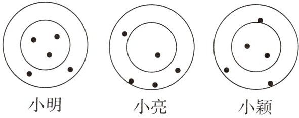 6. 小明、小亮、小颖玩飞镖游戏,他们每人投靶5次,中靶情况如图所示.规定投中同一圆环得分相同,若小明得分21分,小亮得分17分,则小颖得分为(